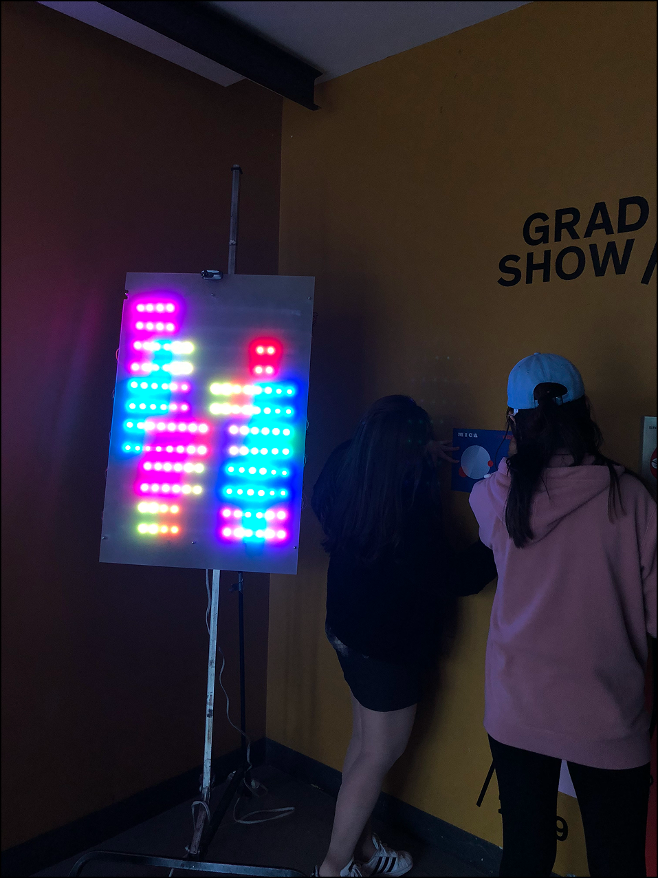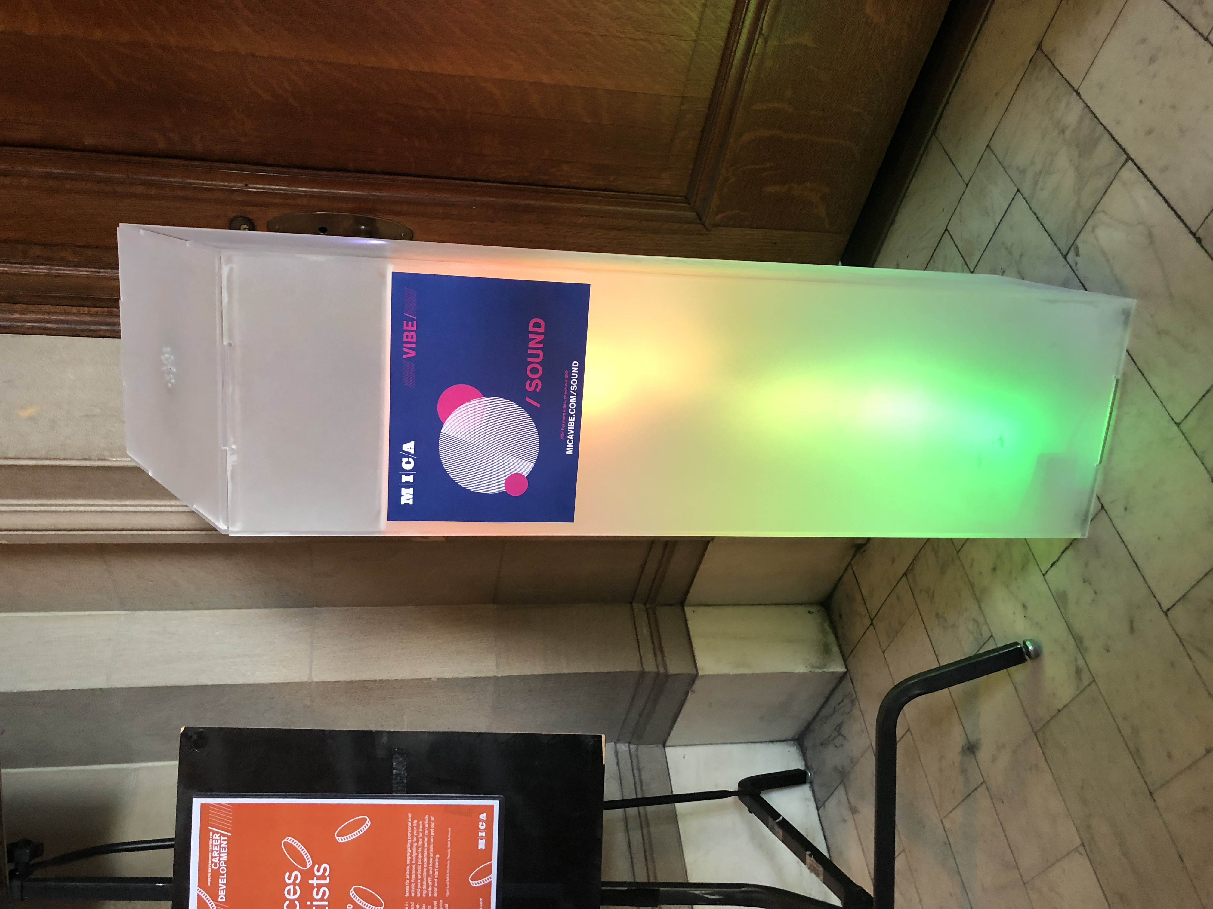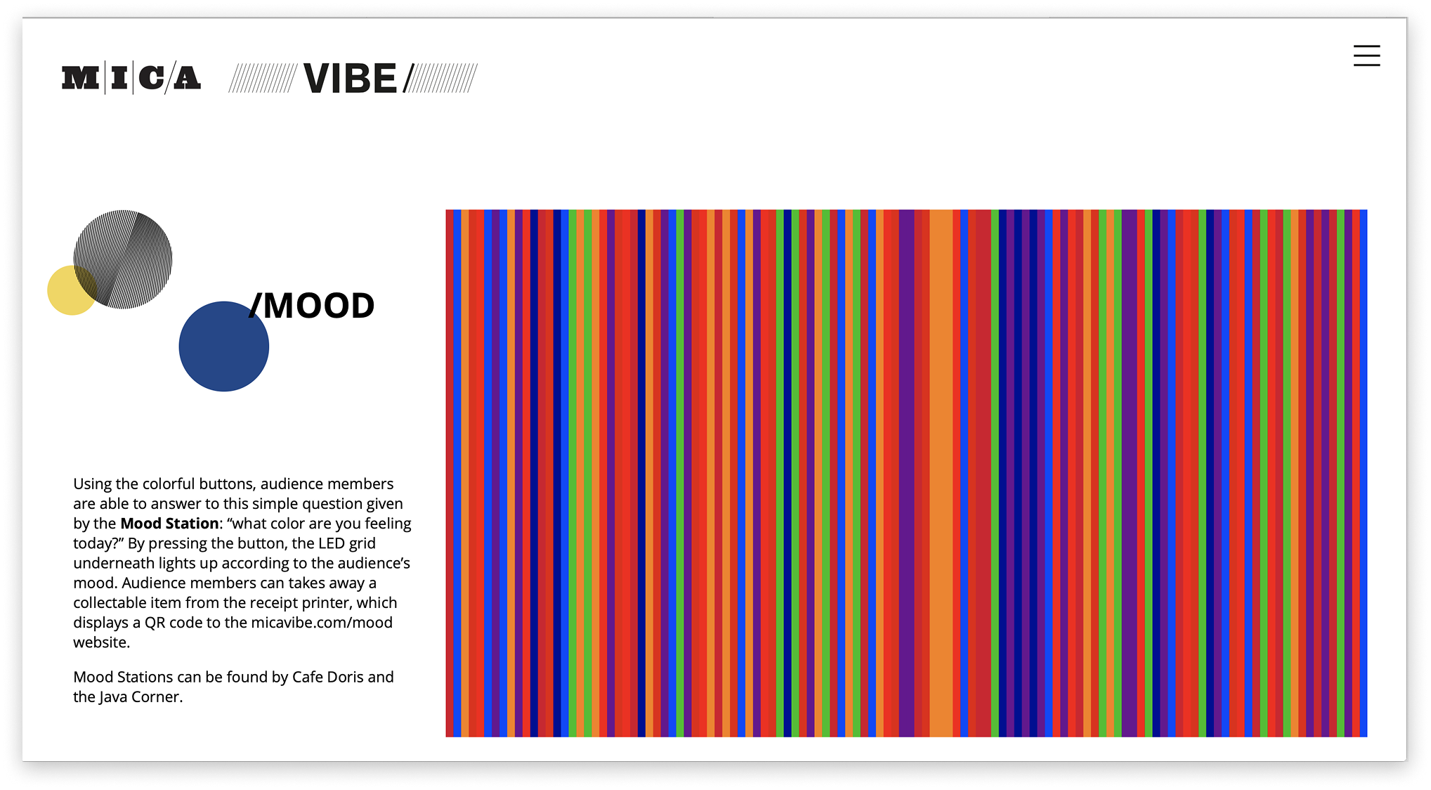The MICAVIBE project was wholly designed and built by students in the Spring 2019 Interactive Spaces class in the Interactive Arts department at MICA. The class was: Blythe Thea Williams, Cheng Qin, Gary Zhang, Heerim Shin, Jess Sanders, Laurain Park, Miri Kim, Peter Turnbull, Serah Choi, and Yeri Choi.