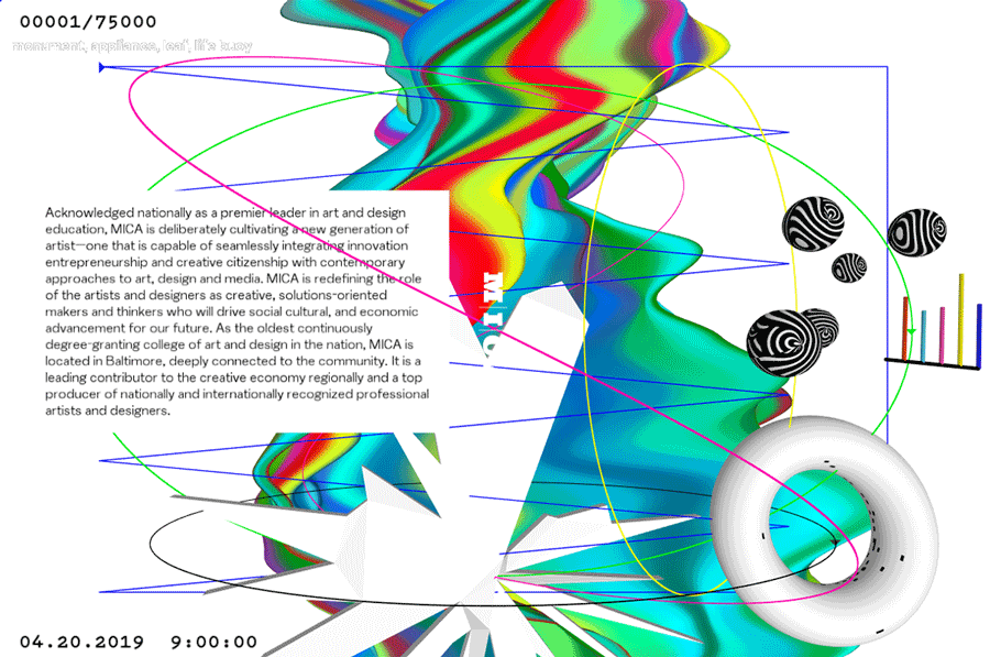 The collected data was transformed into visual systems that generated 68,000 unique book covers for the Maryland Institute College of Art Prospectus. Each cover used the Mood, Sound, Motion, and Love data as graphic inputs — resulting in a publication where every copy reflected a different student’s interactions.